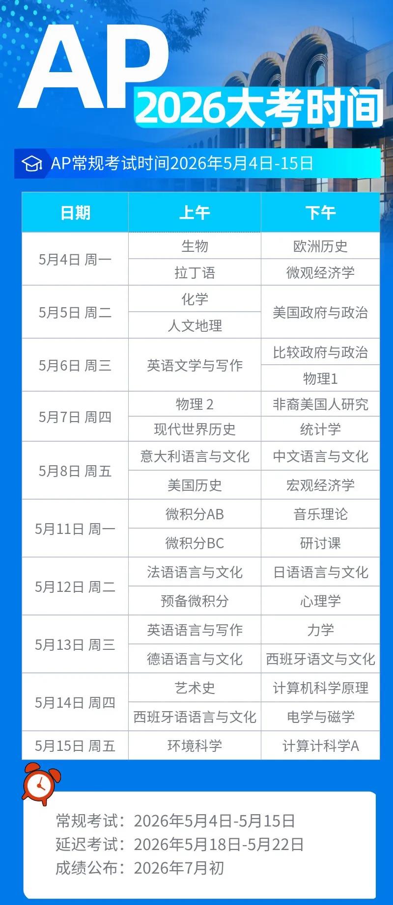 AP考试每年10月份报名,次年5月进行考试。以下是今年AP考试时间安排