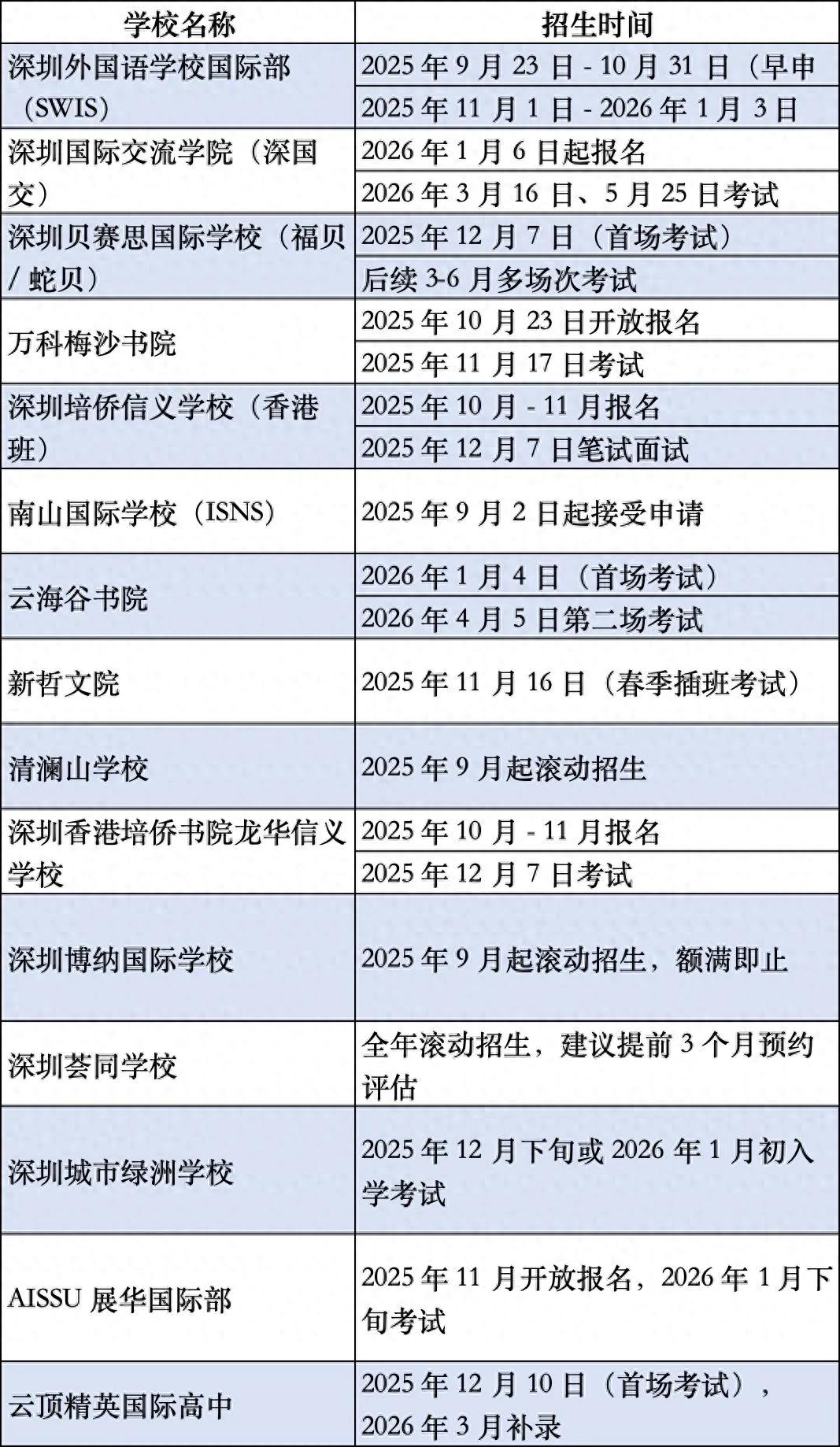 2025 学年刚开启一个多月,深圳国际教育圈已悄然进入 2026 学年招生季。贝赛思、深国交、清澜山、深外湾区、SWIS 等多所顶尖国际学校陆续公布招生考试安排,最早的考试将于 11-12 月开考,新一轮 “生源争夺战” 正式打响。