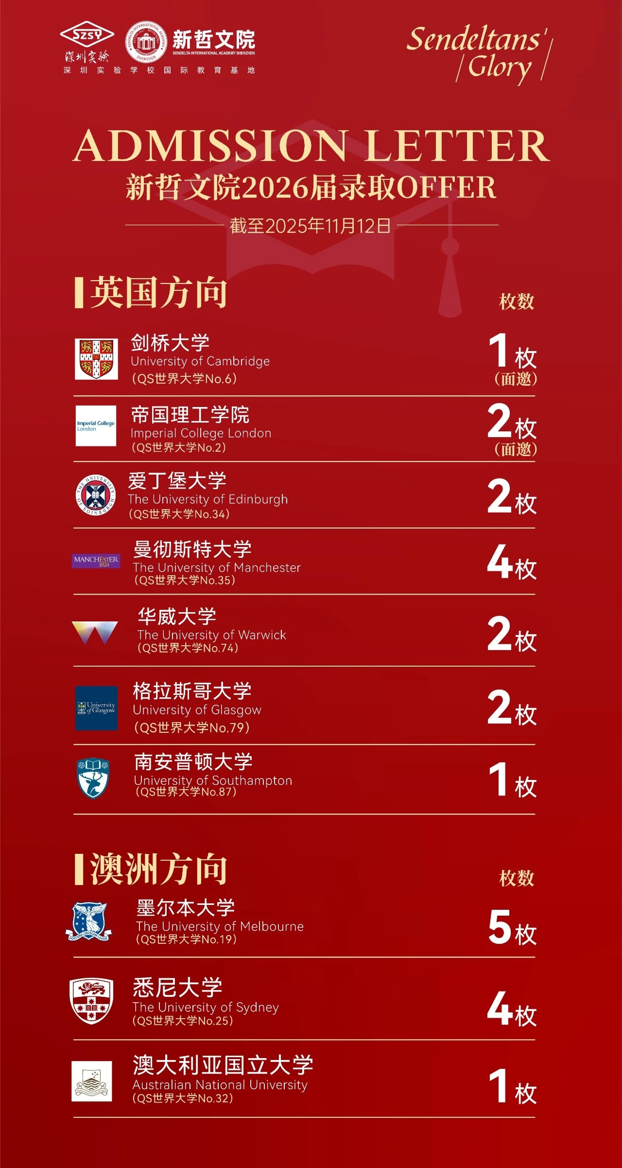 截至目前,已收割2封全英第一、全球第二的帝国理工学院面邀,更有墨尔本大学、悉尼大学、澳大利亚国立大学、爱丁堡大学、曼彻斯特大学、华威大学等一众名校Offer扎堆来袭,战绩亮眼夺目!