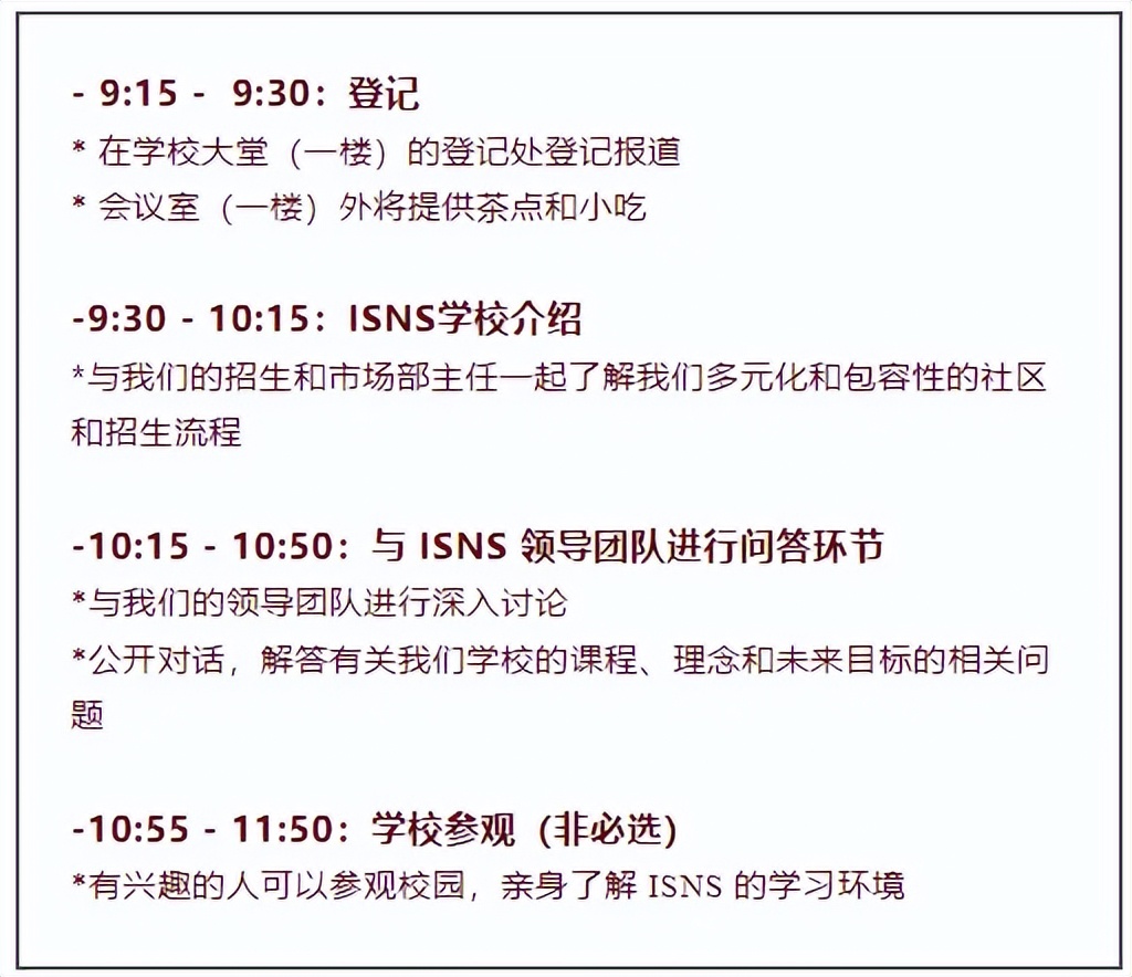 ISNS把一整学年的开放日安排都公布了,每月1-2场,大家可视情况预约: