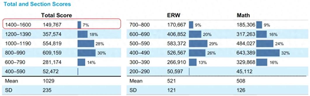 参加考试的人数越来越多,但是从高分段的人数分布来看——1400~1600分数区间的占比仅有7%,数学和文法阅读板块小分在700分以上的也只有9%。