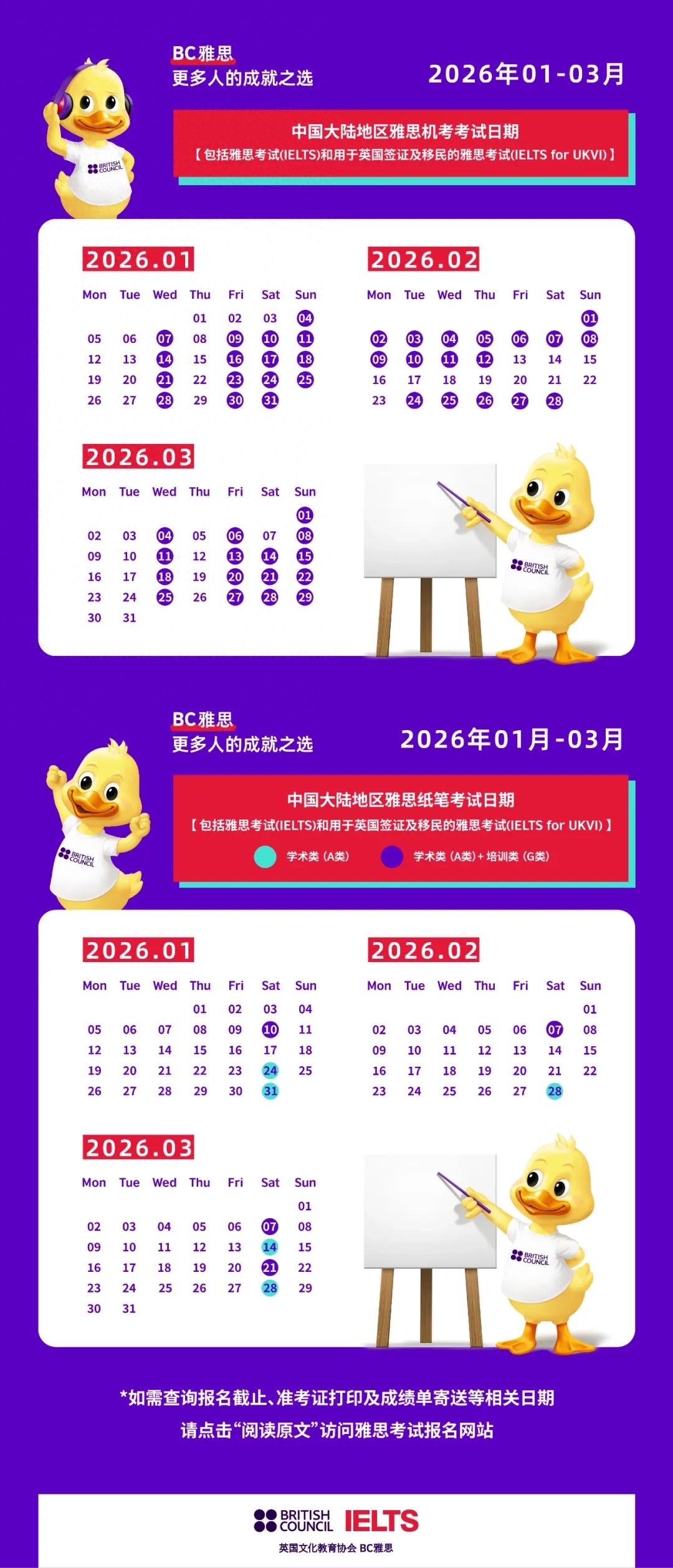 下面是2026年1-3月最新雅思考试日历,考鸭们赶紧选好心仪日期,登录雅思官网报名,抢占开年考季先机~