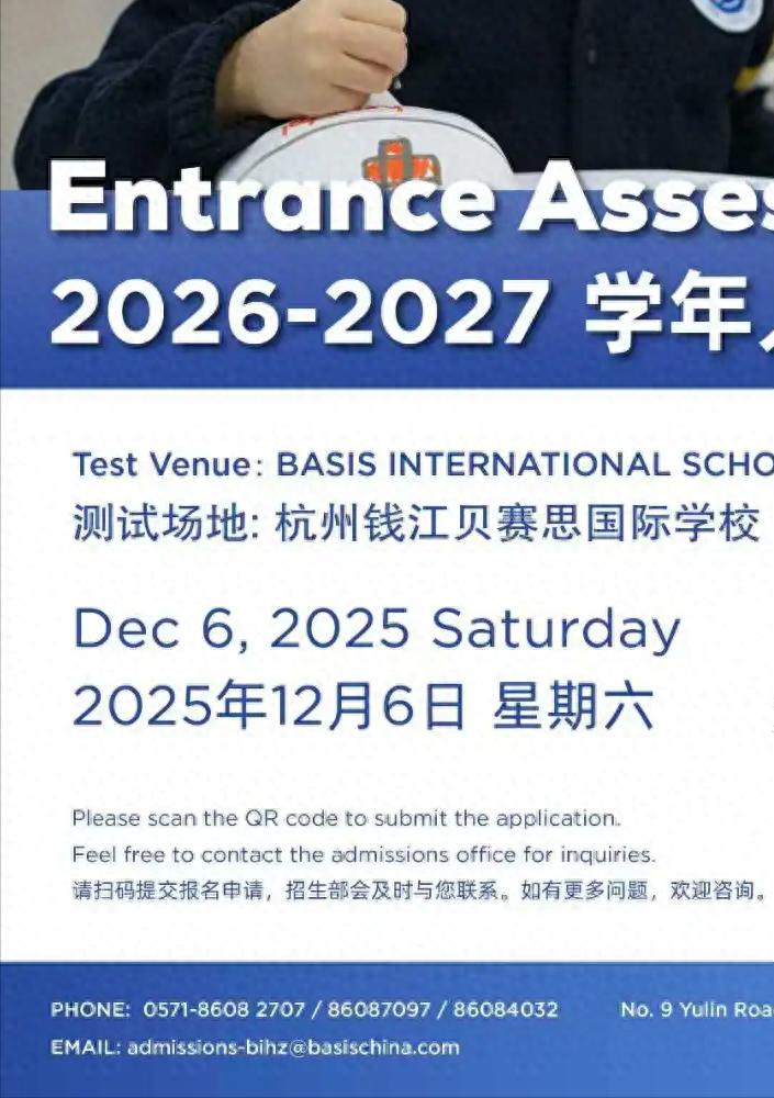 杭州钱江贝赛思国际学校现已开放2026-2027学年PreK1-G9(幼儿园至九年级)的学位申请!学校将于12月6日(星期六)举行首场学业水平测试。贝赛思其他校区也已同步开放申请,所有校区都在同一天举行入学测试。