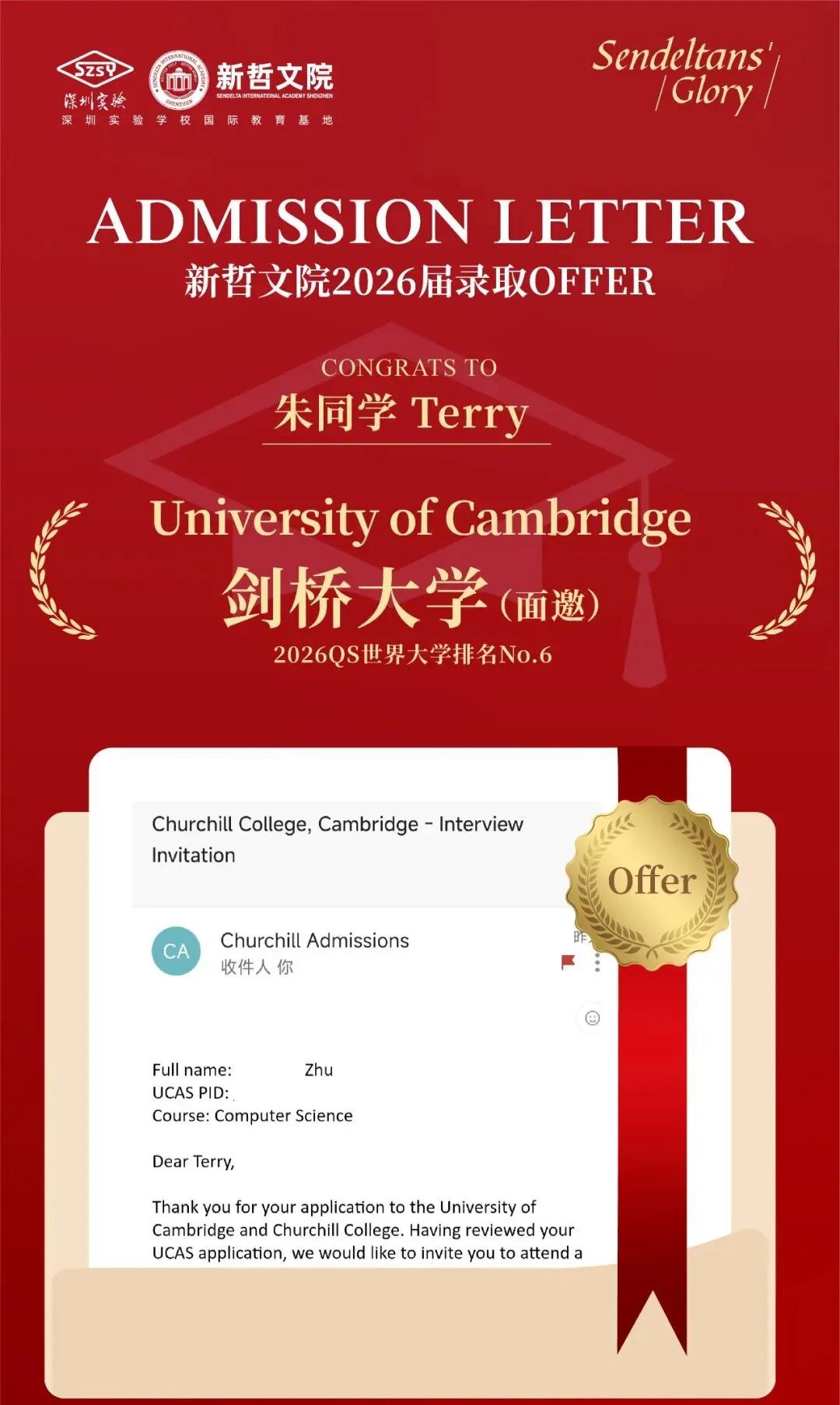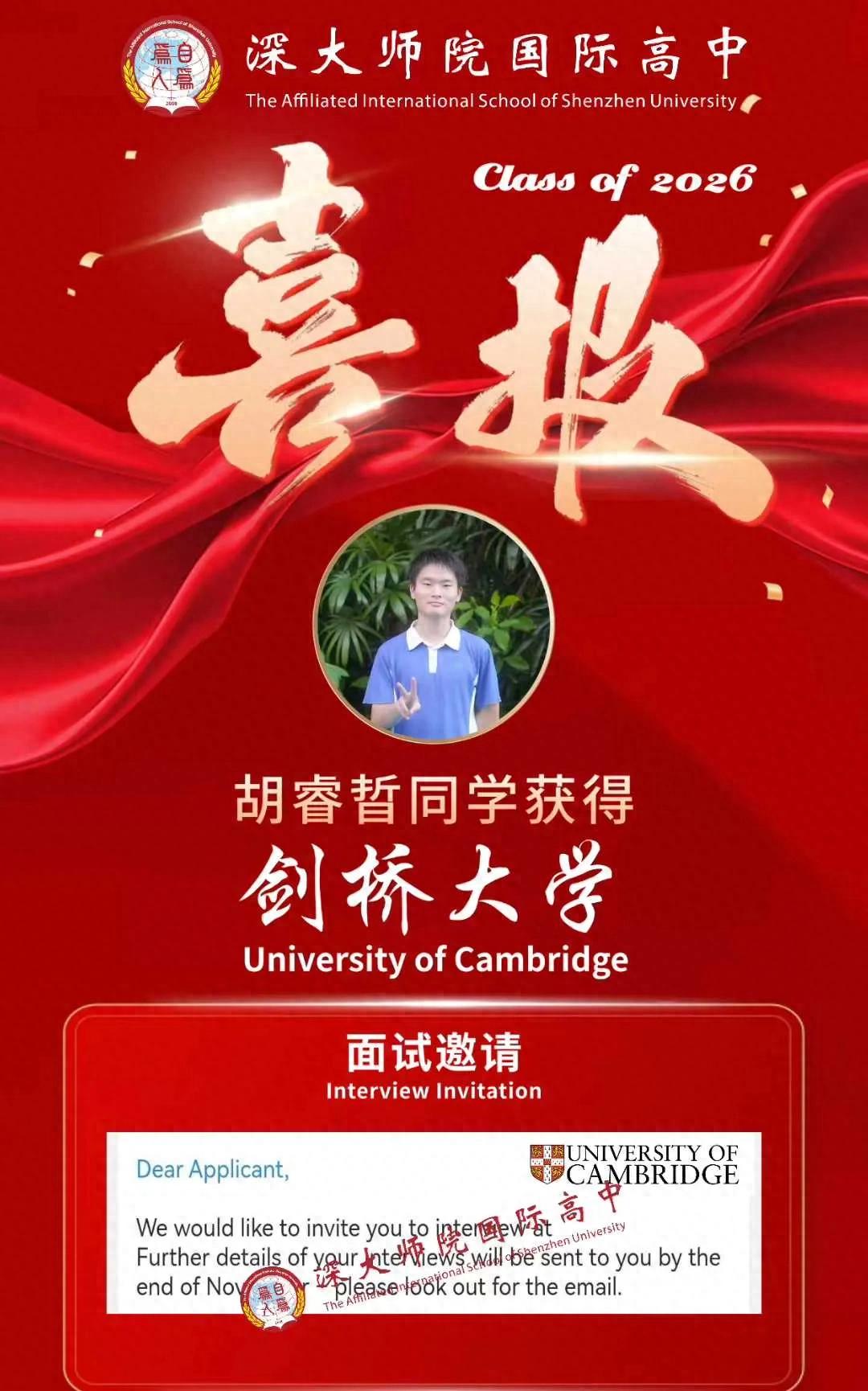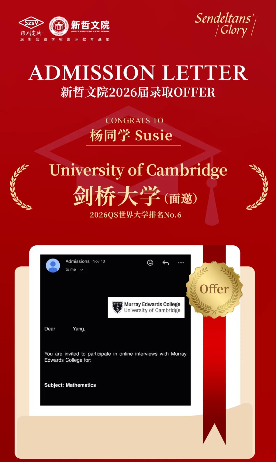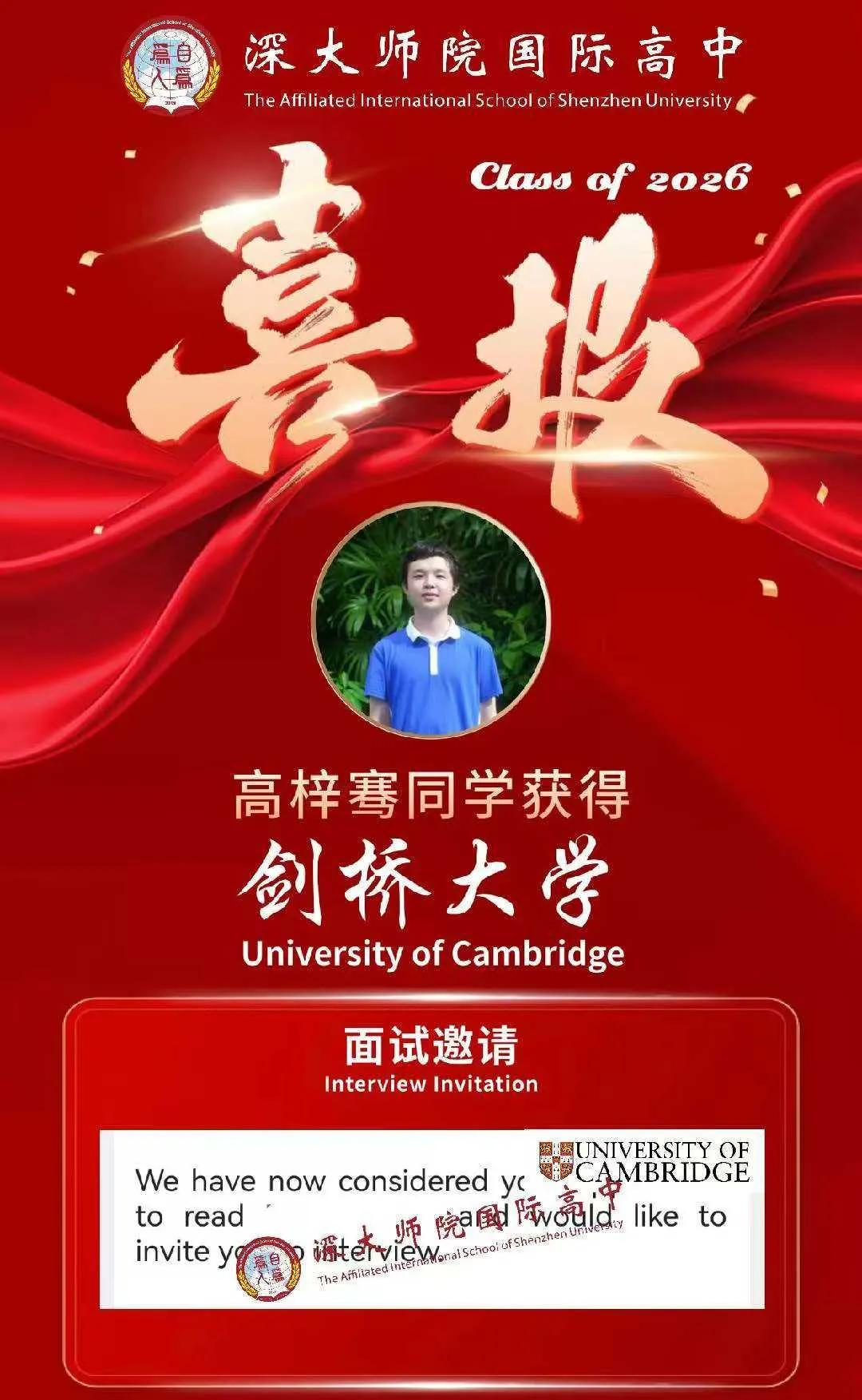 2025年,深国预V班学生一举斩获3封剑桥大学预录取offer;今年学校的首封剑桥大学(数学专业)面邀也闪亮登场!