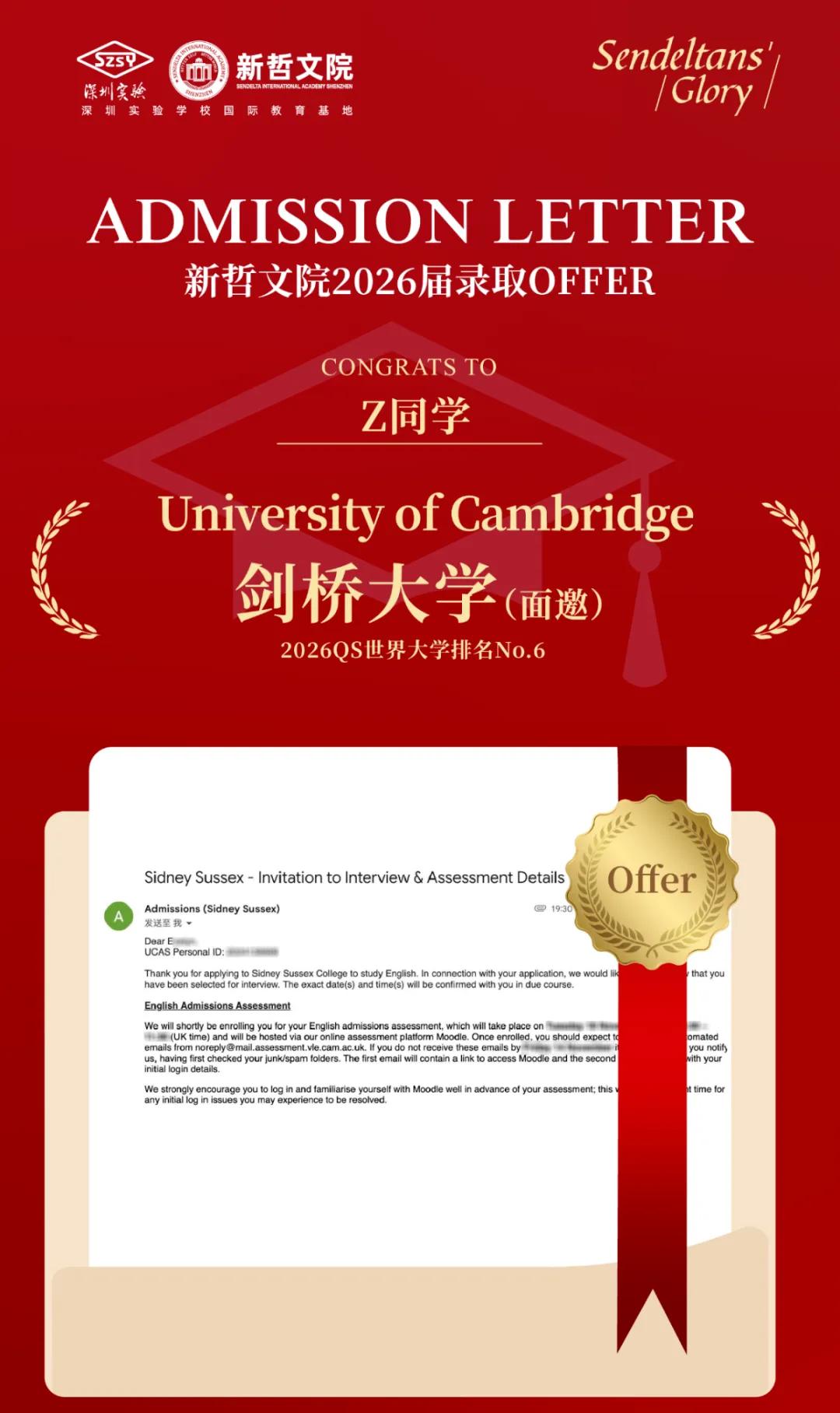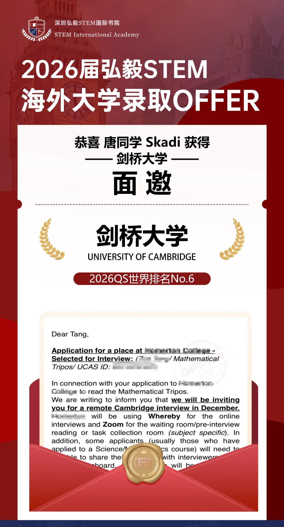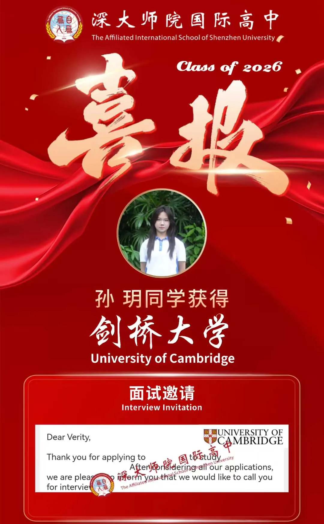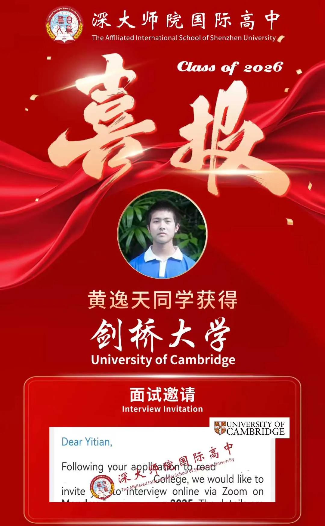 2025年,深国预V班学生一举斩获3封剑桥大学预录取offer;今年学校的首封剑桥大学(数学专业)面邀也闪亮登场!