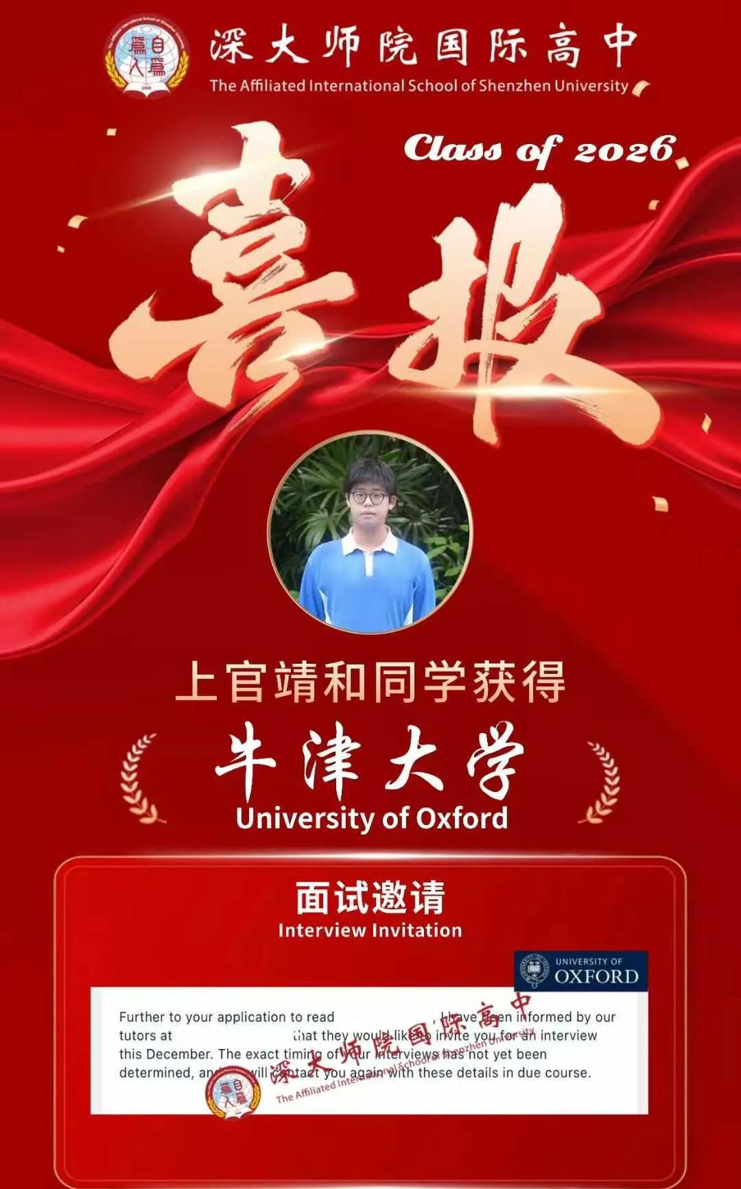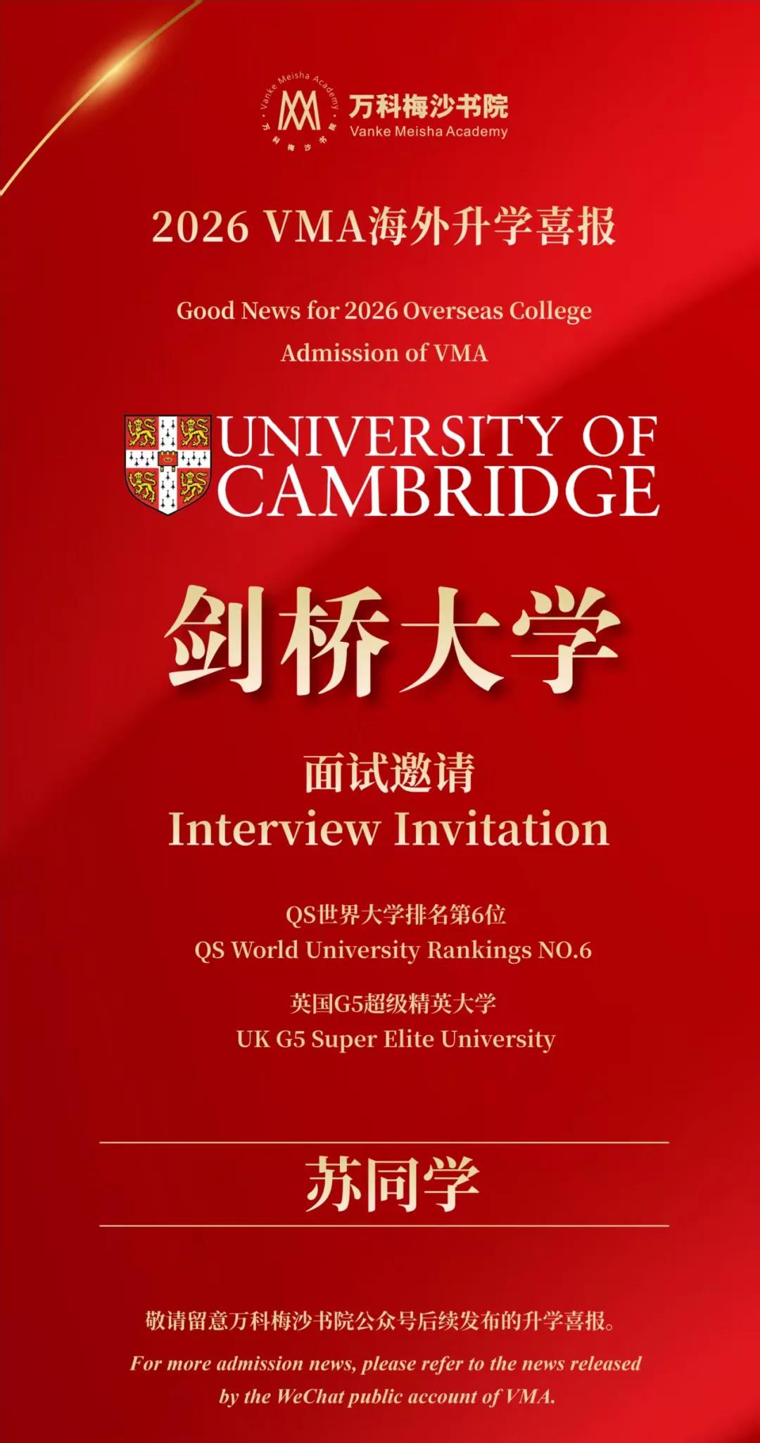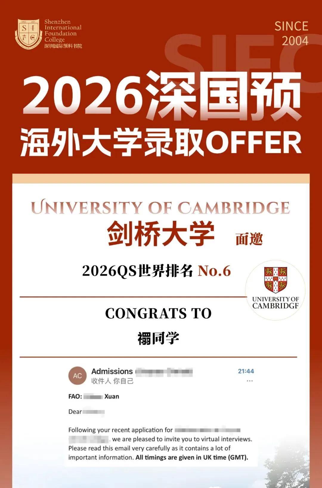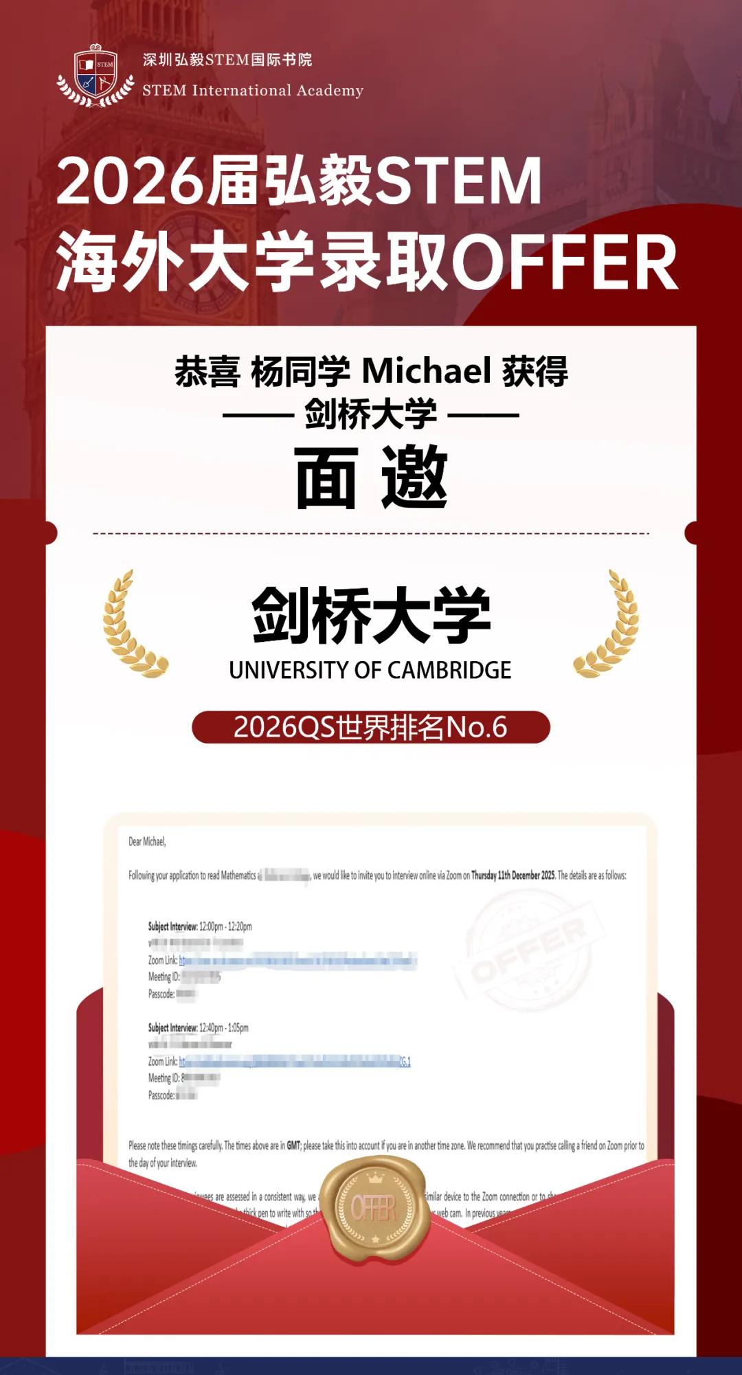 2025年,深国预V班学生一举斩获3封剑桥大学预录取offer;今年学校的首封剑桥大学(数学专业)面邀也闪亮登场!