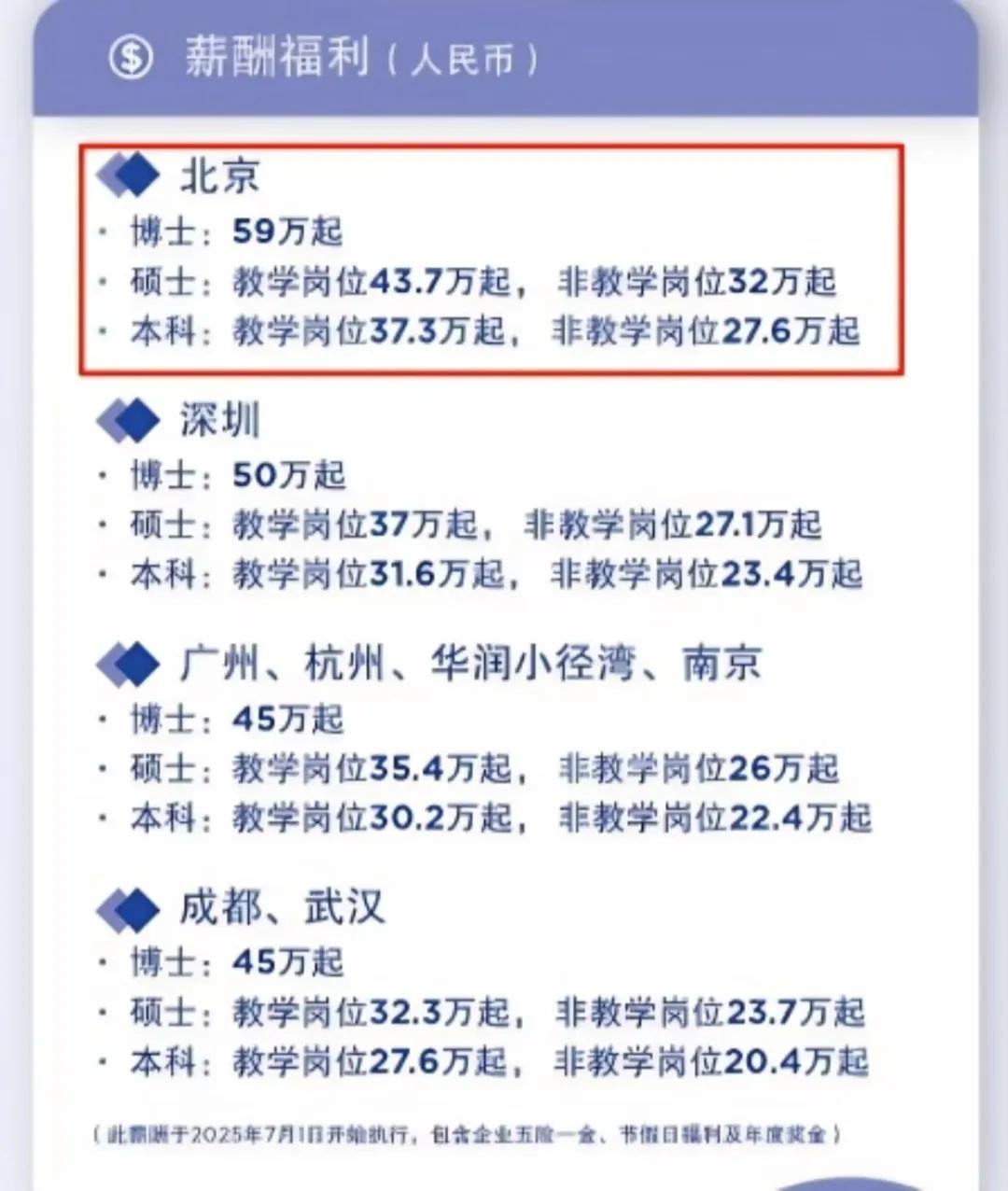 教学岗的薪资更是令人咋舌:博士59万年薪起、硕士43.7万年薪起、本科37.3万年薪起,是贝赛思中国所有校区中起薪最高的。