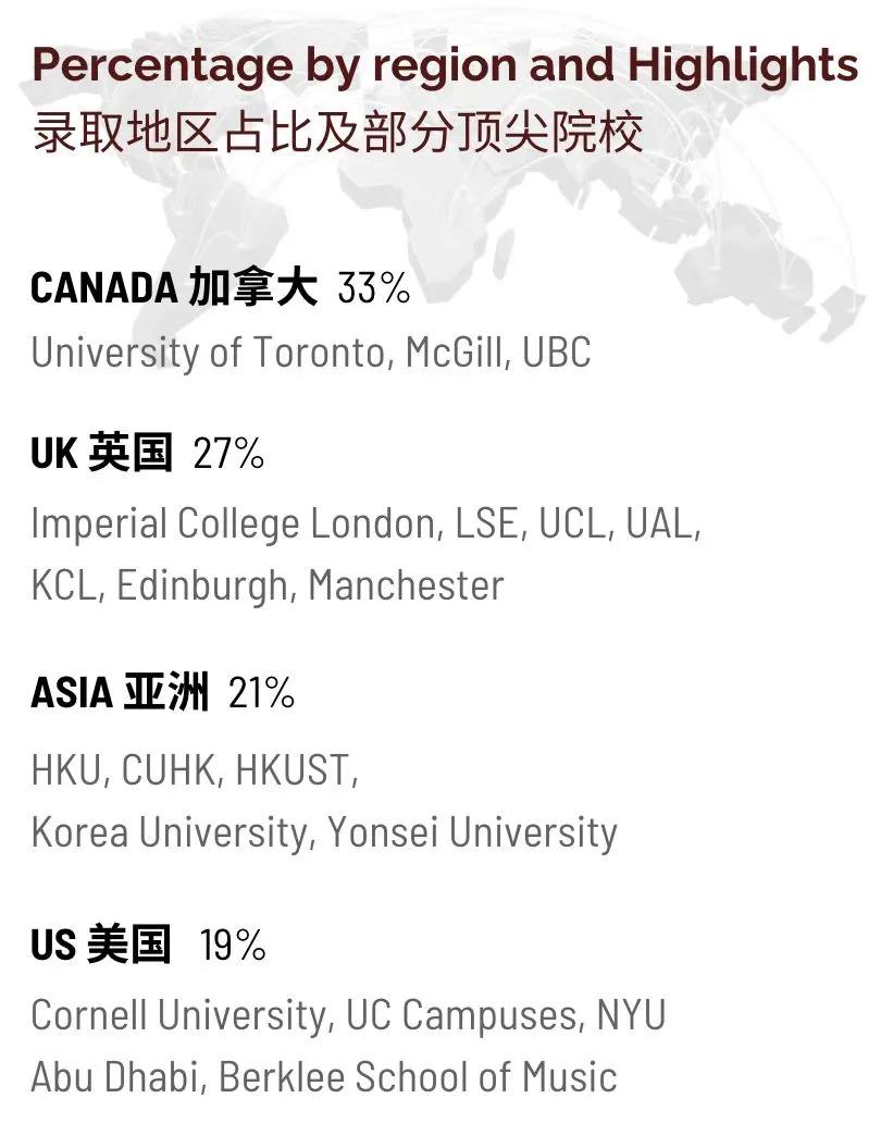 2025录取顶尖院校包括:美国方向包括康奈尔大学、霍利奥克学院、加州大学圣地亚哥分校等;英国方向包括帝国理工大学、伦敦大学学院等;加拿大方向包括多伦多大学、麦吉尔大学、不列颠哥伦比亚大学等;亚洲方向包括香港大学、中文大学、科技大学、延世大学、高丽大学等。