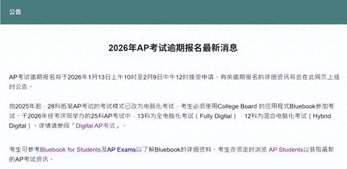 香港考评局放出了AP逾期报名新消息:2026年香港AP逾期报名时间于2026年1月13日至2月9日开放报名。